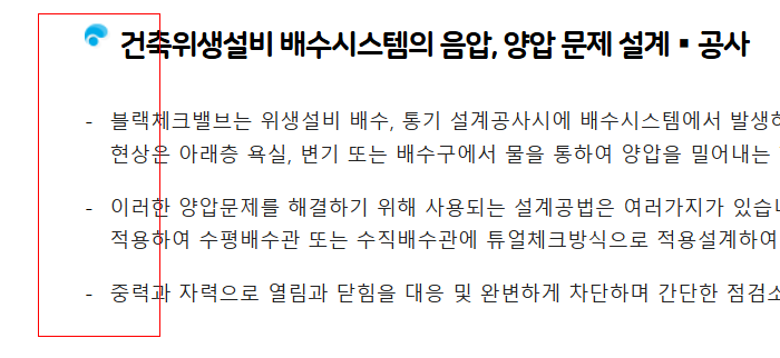<li>블랙체크밸브는 위생설비 배수, 통기 설계공사시에 배수시스템에서 발생하는 양압 또는 음압과 배수통기시스템의 부적합한 설계, 공사때에 발생하는 유압펌프 현상은 아래층 욕실, 변기 또는 배수구에서 물을 통하여 양압을 밀어내는 현상을 발생시킵니다.</li>