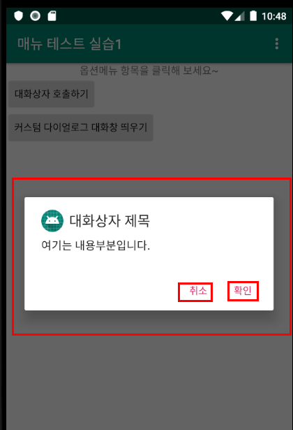 dialog.setTitle("커스텀 다이얼로그 제목").setMessage("다이얼로그 대화창 내용입니다.")