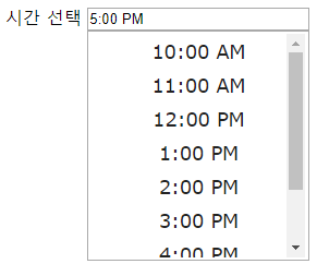 상기 그림과 같이 AM , PM 원하는 시간대를 설정할 수도 있고, 이를 select 박스 형태로 시간대를 선택할 수 있도록 해 준다.