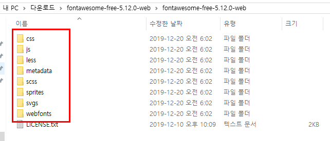 위에서 fontawesome-free-5.12.0-web 폴더를 내호스팅 root 에 올리고 폴더명을 간단히 fontawesome 으로 변경해 놓았다.