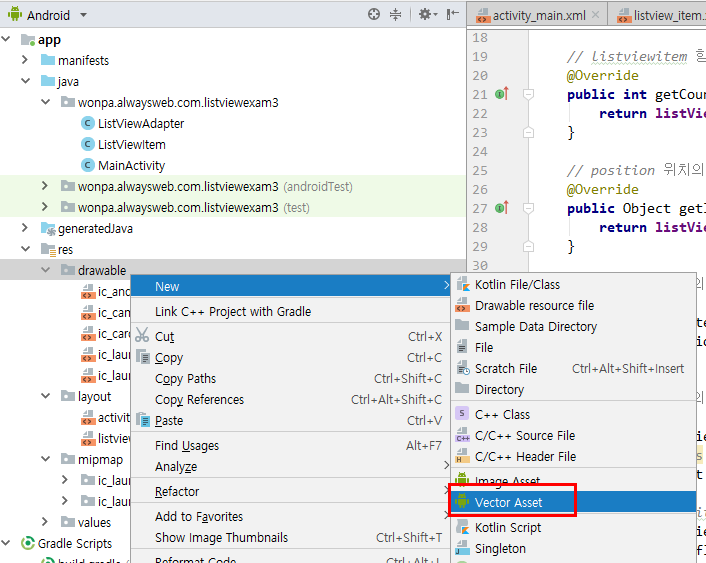 adapter.addItem(ContextCompat.getDrawable(this,R.drawable.ic_android_black_24dp),"아이콘1번", "24dp Black");