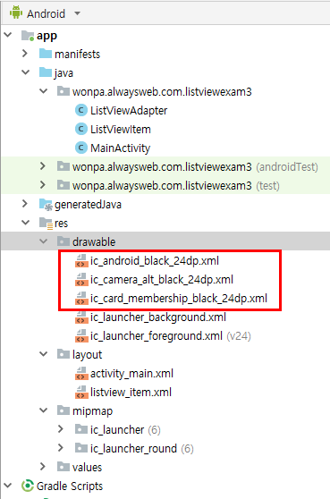 adapter.addItem(ContextCompat.getDrawable(this,R.drawable.ic_card_membership_black_24dp),"아이콘3번", "24dp Black");