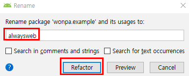 저는 example 패키지명을 alwaysweb 으로 변경하고자 합니다.
