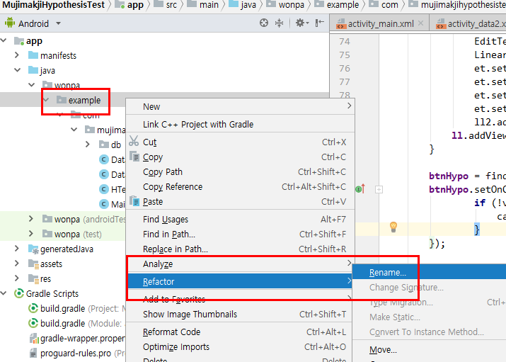 마우스 우측버튼으로 나오는 메뉴에서 Refactor > Rename 클릭합니다.