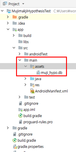 상기 도식화면과 같이 muji_hyho.db DB파일을 assets 내에 복사하면