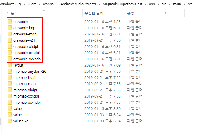 그러면 아래의 같이 윈도우 탐색기가 실행되며 res 폴더내 하위 폴더 부분을 자동으로 열어 준다.
