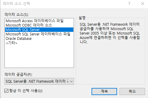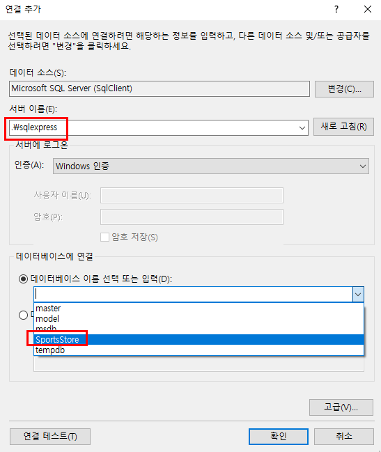 위의 그림에서 인증은 windows 인증으로 바로 편하게 접속한다.