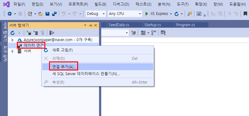 그런다음 Visual Studio 상으로 서버탐색기상에서 직접 아래 그림을 참고하여 접속하면 된다.