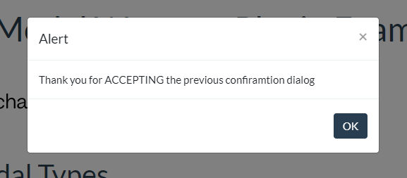 BootstrapModalWrapperFactory.alert("Thank you for ACCEPTING the previous confiramtion dialog");
