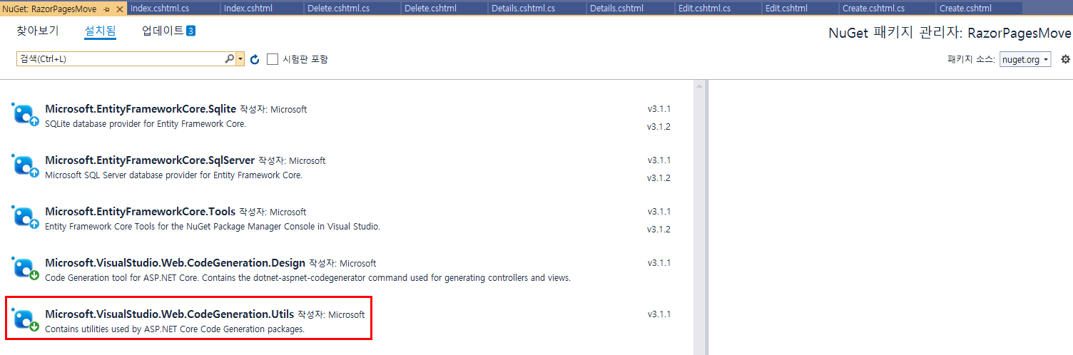 ASP.NET Core 자습서에서 Razor 페이지 예제파일 보는중에 Entity Framework 를 추가하는 중에 아래와 같은 에러 메세지가 발생하였다.