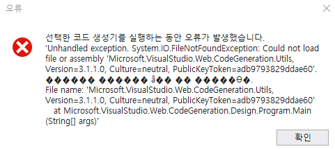 [asp.net core MVC] Unhandled exception. System.IO.FileNotFoundException. Could not load file or assembly. Microsoft.VisualStudio.Web.CodeGeneration.Utils 본문