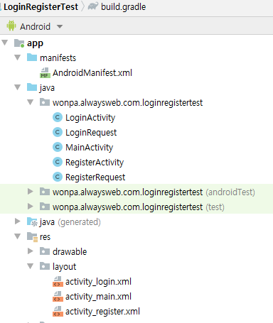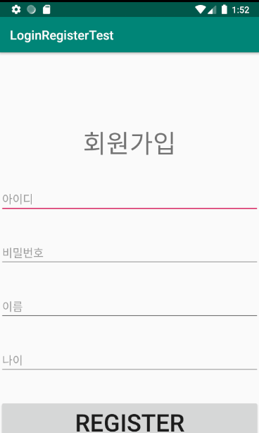 회원가입 화면 RegisterActivity 와 회원가입 POST 웹요청응답 처리를 하는 RegisterRequest 클래스로 어우러지게 하였다.