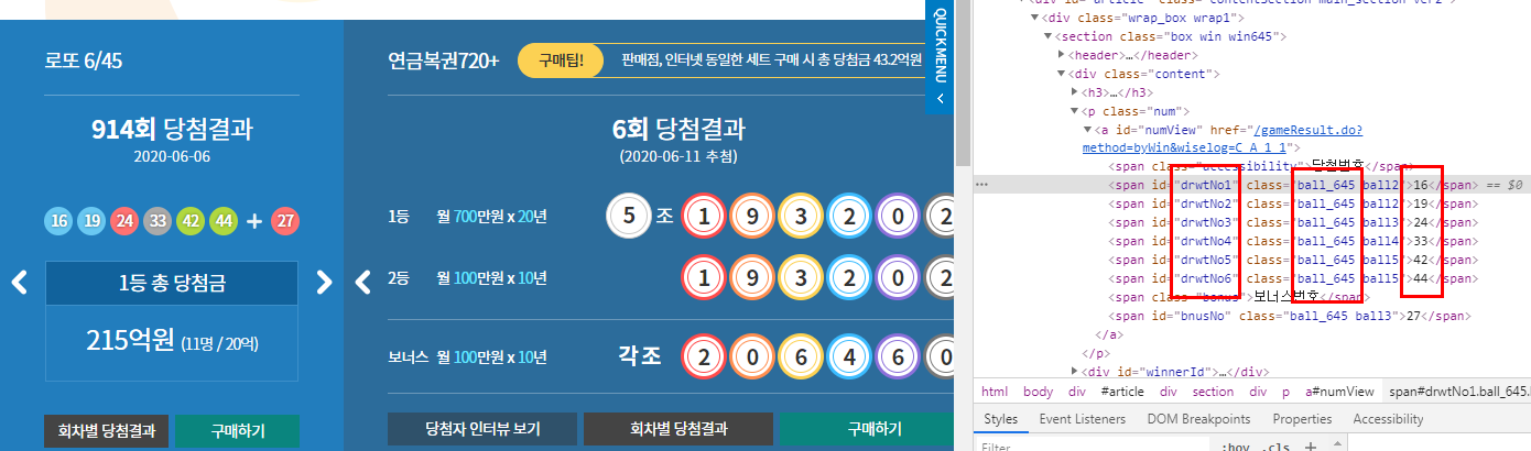 [python] 파이썬 기본 수업 2일차(2/6) - 크롤링, 로또번호 긁어오기 본문