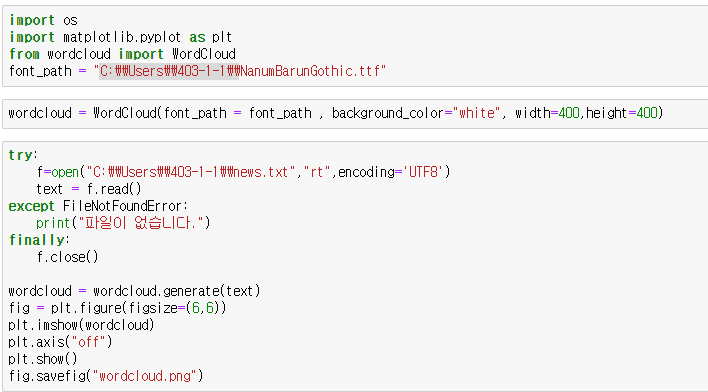 위에서 pip install 해서 워드클라우드를 설치하는 내용인데, 이미 설치되어 있다고 메세지가 나온다.