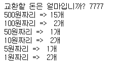 # 동전 교환 프로그램(500원, 100원, 50원, 10원, 5원, 1원 동전)