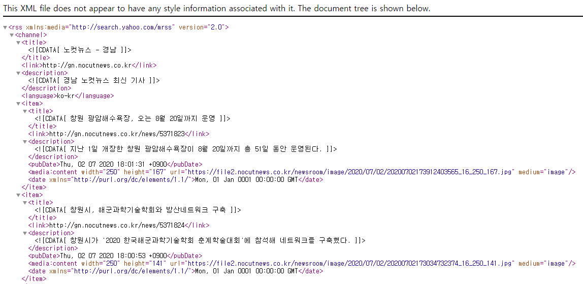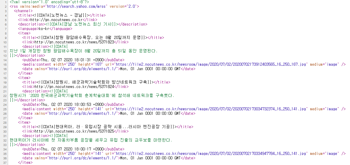 뉴스 기사 등을 보통은 RSS 형식으로 텍스트 형태로 제공하고 있는데, 이번에는 이러한 xml 형태로 되어 있는 RSS을 파싱해보기로 한다.