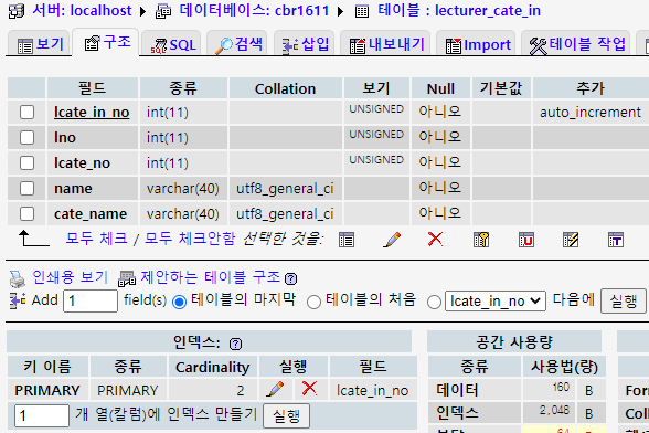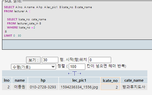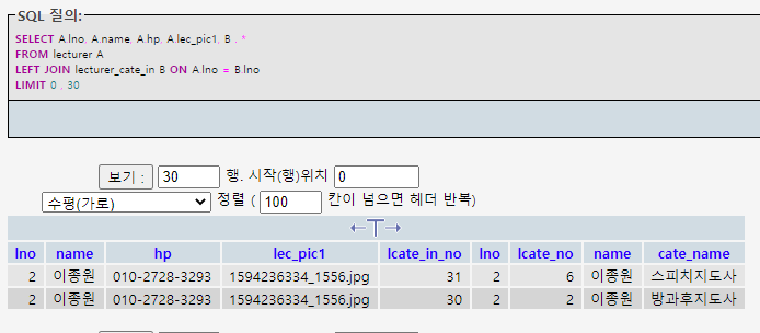 내부 조인 Inner join 형태로 lecturer (강사) 와 lecturer_cate_in (강사와 과목의 1:다:1 테이블) 결합하여,