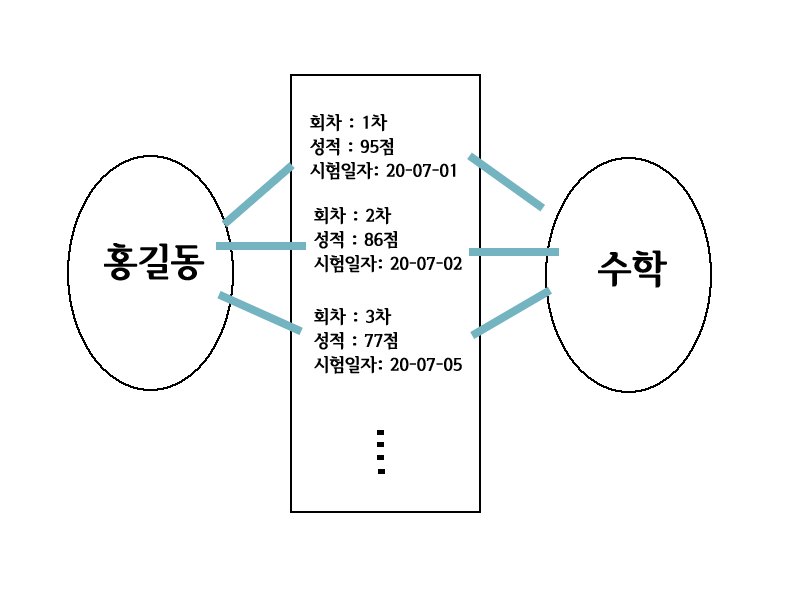 이렇게 1:다:1 관계로 DB 를 구성하게 되면, 홍길동 1명에 중간 다 테이블에 성적,시험일자 등의 칼럼을 구성할 수 있으며, 수학 1개로 만들 수 있다.