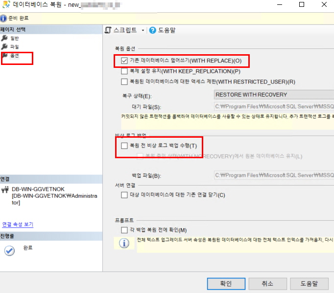 이제 정상적으로 해당 DB를 선택하고 복원해보도록 하자.