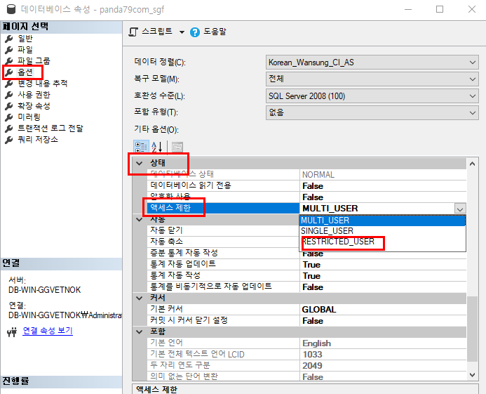 복원하고자 하는 DB의 속성에서 옵션을 눌러, RESTRICTED_USER 를 선택한다.