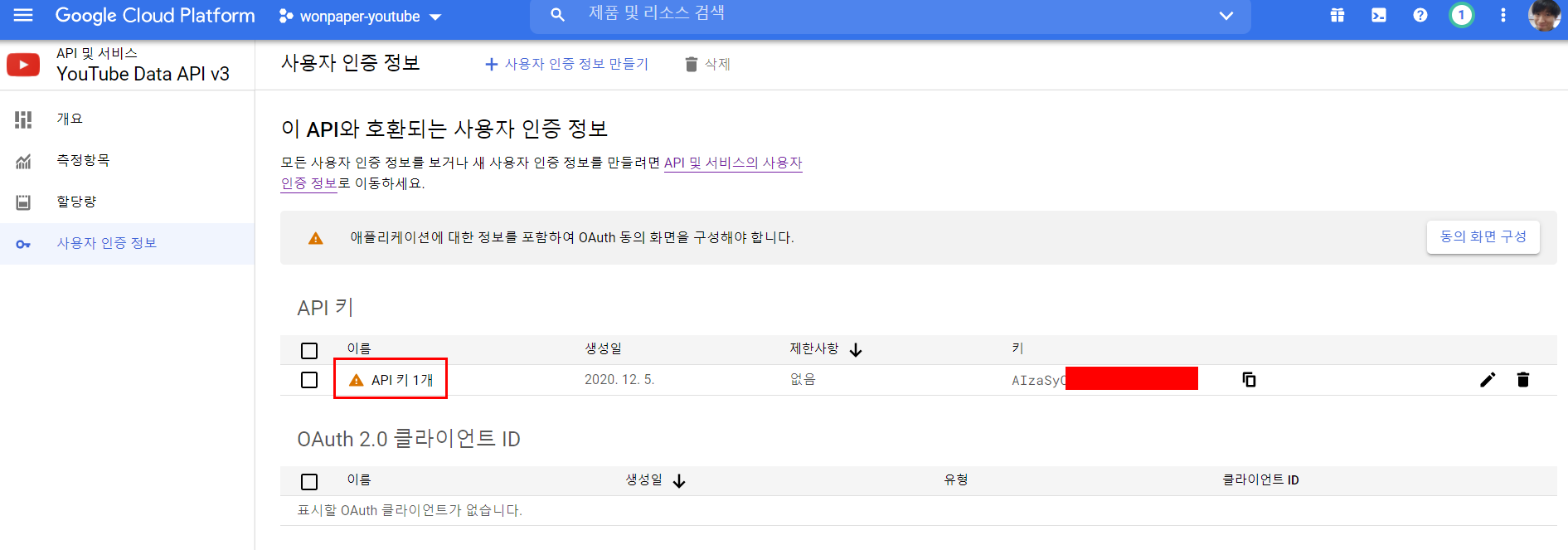 Youtube API 를 이용하기 위해서는 일단 Key 값부터 받아야 한다.