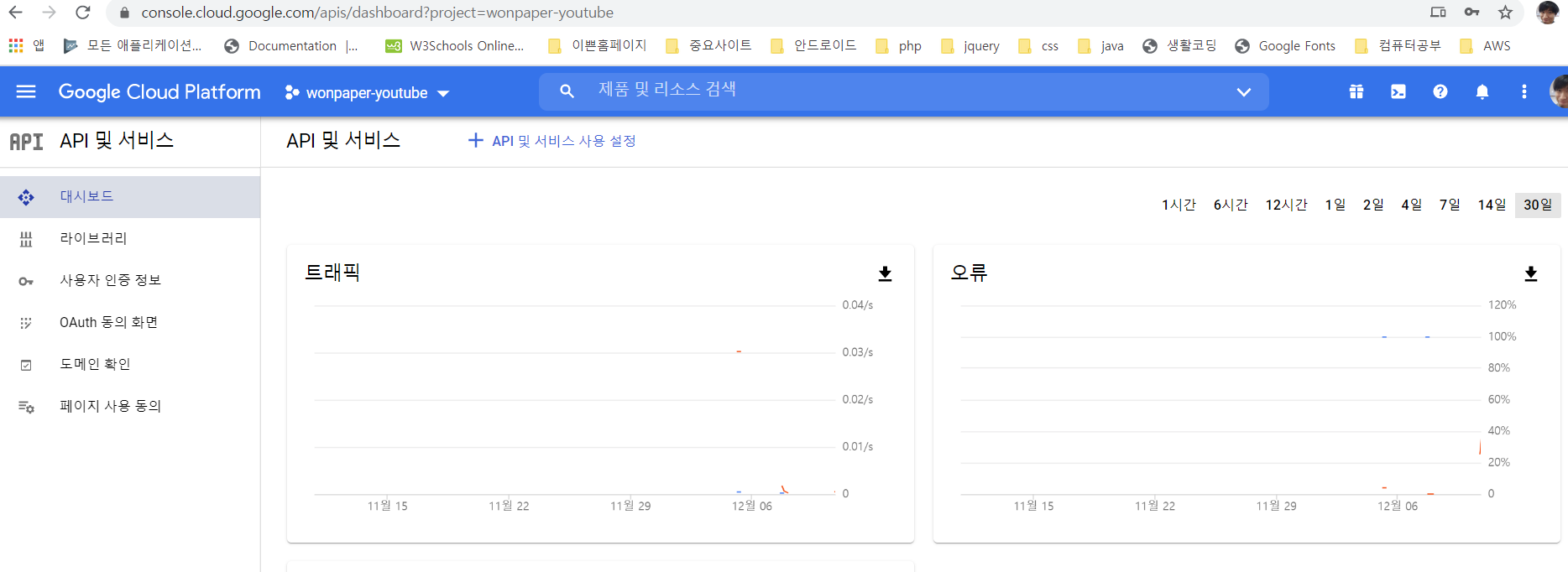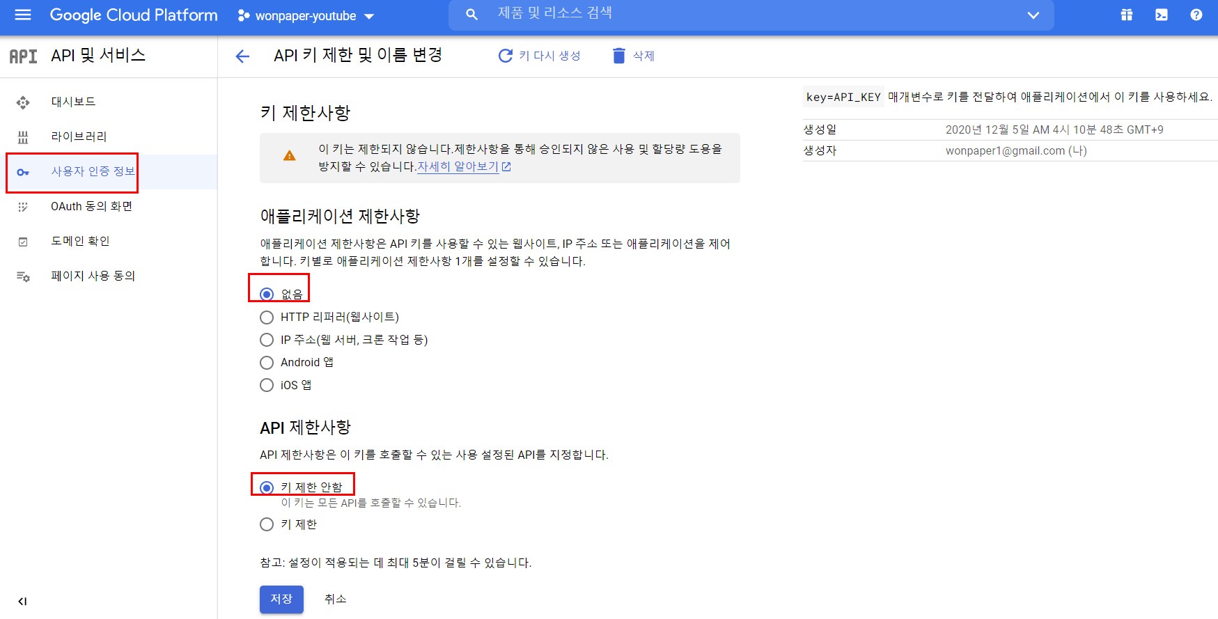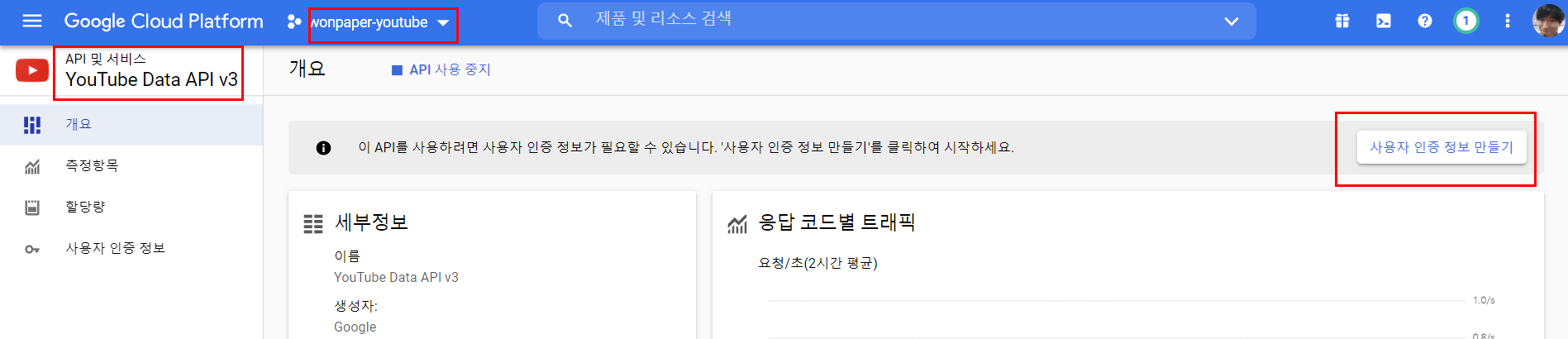 구글 클라우드 콘솔페이지로 가서 Youtbube Api 접근용 key를 생성한다.