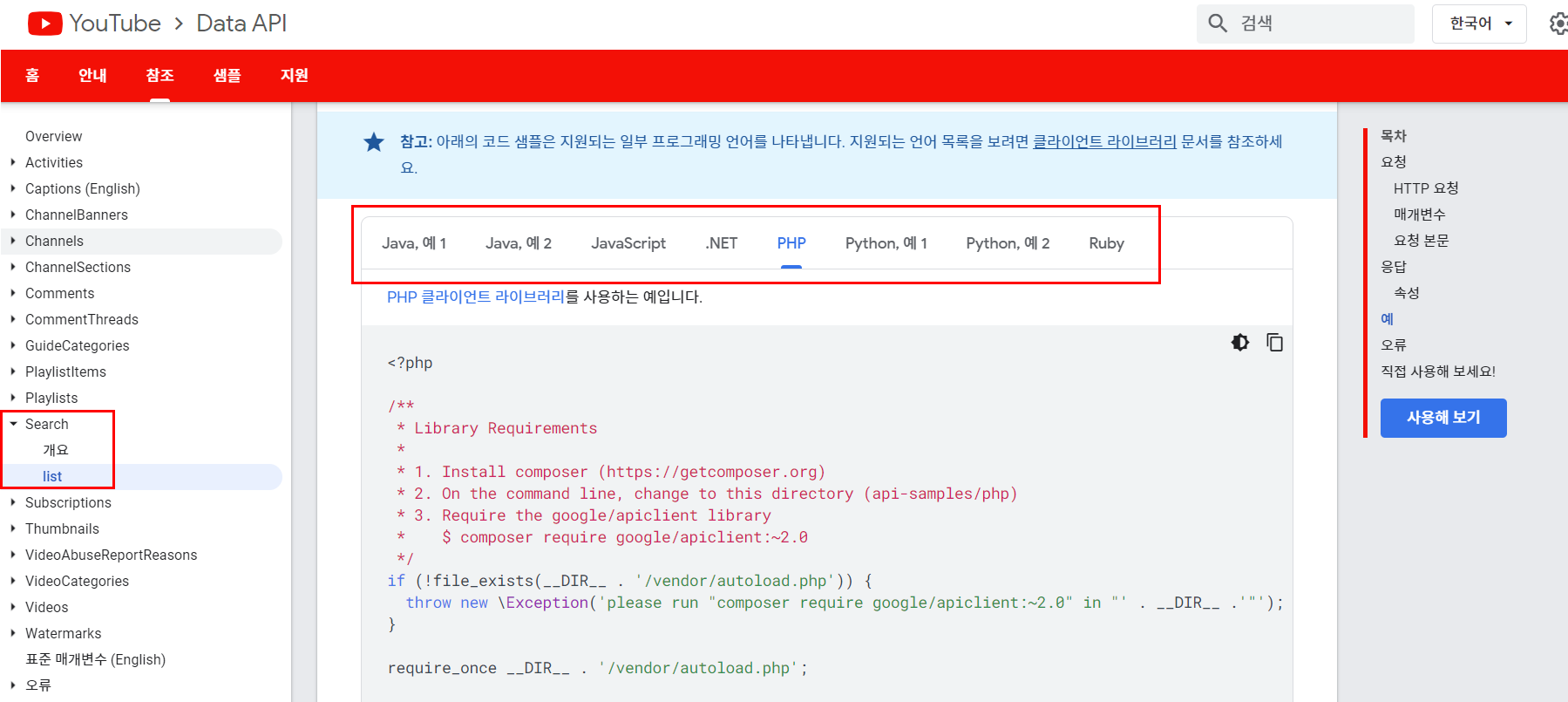 Youtube API Document 를 살펴보면 각 언어별로 상세한 샘플 코드도 제공하고 있다.