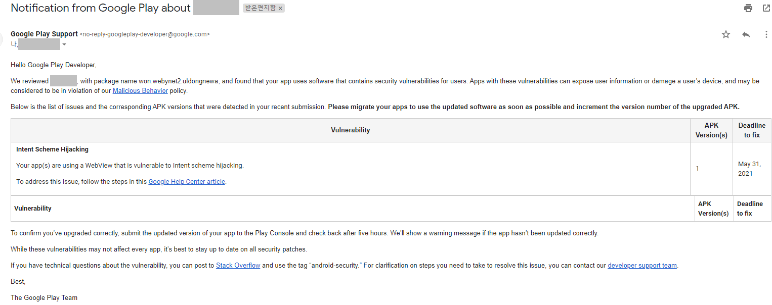 인텐트 스키마 도용 취약점 문제 해결 - Google 고객센터