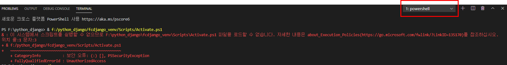 [Django] VSCode 에서 CategoryInfo : 보안 오류: (:) [], PSSecurityException 날때