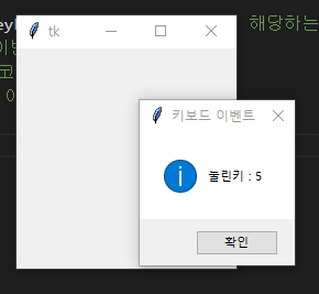 1 2 3 4 5 6 7 8 9 10 11 12 13 | from tkinter import * from tkinter import messagebox def keyEvent(event): messagebox.showinfo("키보드 이벤트","눌린키 : " + chr(event.keycode)) window = Tk() window.bind("<Key>",keyEvent) #<Key> 모든키에 해당하는 이벤트코드 # <Return> : enter키 이벤트코드 # <less> : < 키 이벤트코드 # <space> : 스페이스바 이벤트코드 window.mainloop() | cs |
