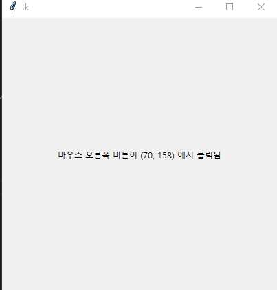 1 2 3 4 5 6 7 8 9 10 11 12 13 14 15 16 17 18 19 20 21 22 23 24 25 26 | from tkinter import * def clickMouse(event): txt = "" if event.num == 1: txt += "마우스 왼쪽 버튼이 (" elif event.num == 2: txt += "마우스 가운데 버튼 (" elif event.num == 3: txt += "마우스 오른쪽 버튼이 (" txt += str(event.y) + ", " + str(event.x) + ") 에서 클릭됨" label1.configure(text=txt) window = Tk() window.geometry("400x400") label1 = Label(window,text="이곳이 바뀜") # <Button> : 마우스 모든 버튼 이벤트 코드 # <Button-1> : 마우스 왼쪽 버튼 이벤트 코드 # <Button-3> : 마우스 오른쪽 버튼 이벤트 코드 window.bind("<Button>",clickMouse) label1.pack(expand=1,anchor=CENTER) window.mainloop() | cs |