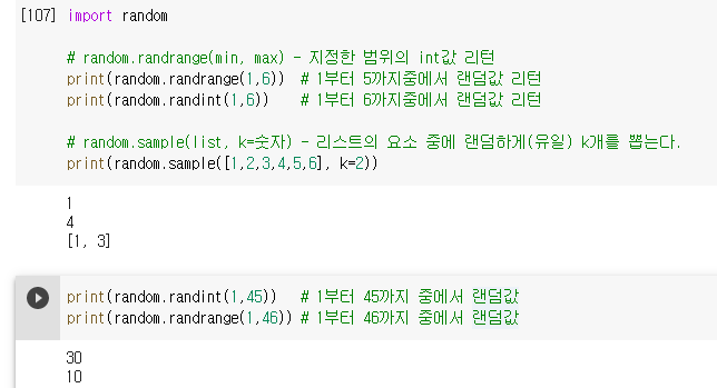 [Python] random.radrange함수, random.sample함수 익히기 - 로또번호 구하기 본문