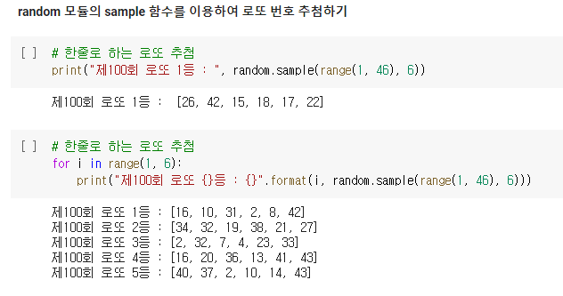 참고로 random.sample 함수로 로또번호도 만들어보자.