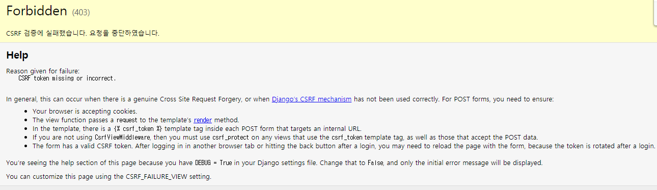 [Django] CSRF 검증에 실패했습니다. 요청을 중단하였습니다. 본문