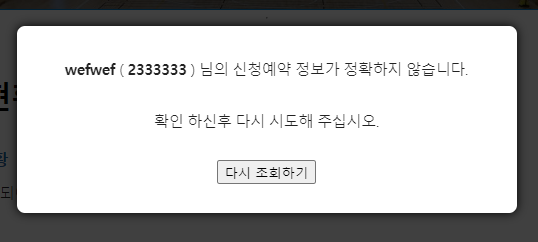 <p style="text-align:center;"><b><%=name%></b> ( <b><%=hp%></b> ) 님의 신청예약 정보가 정확하지 않습니다.<br><br>확인 하신후 다시 시도해 주십시오.