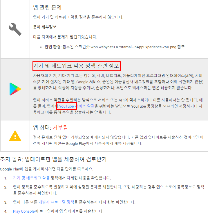 구글앱을 등록하여 심사하는 과정에서 앱등록 거부 메세지중에