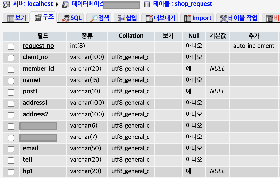 shop_request 테이블 - 주문내역 기본 테이블 (주문번호, 주문자, 주문자 연락번호, 주소, 주문시간, 결제금액 등)
