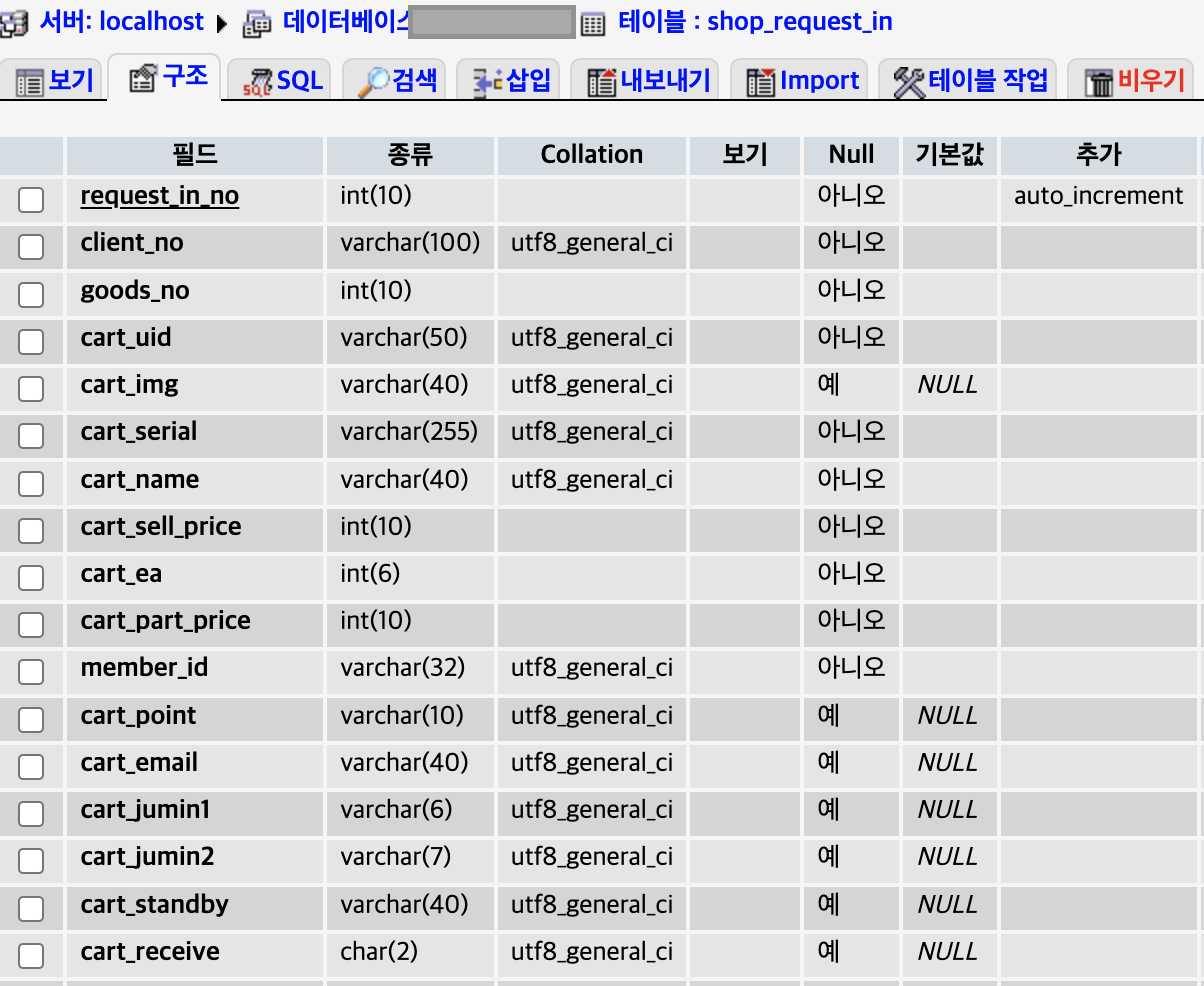 shop_request_in 테이블 - 주문내역 세부 상품 테이블 (주문번호, 상품명, 주문수량, 상품 옵션 정보, 배송상태 등)