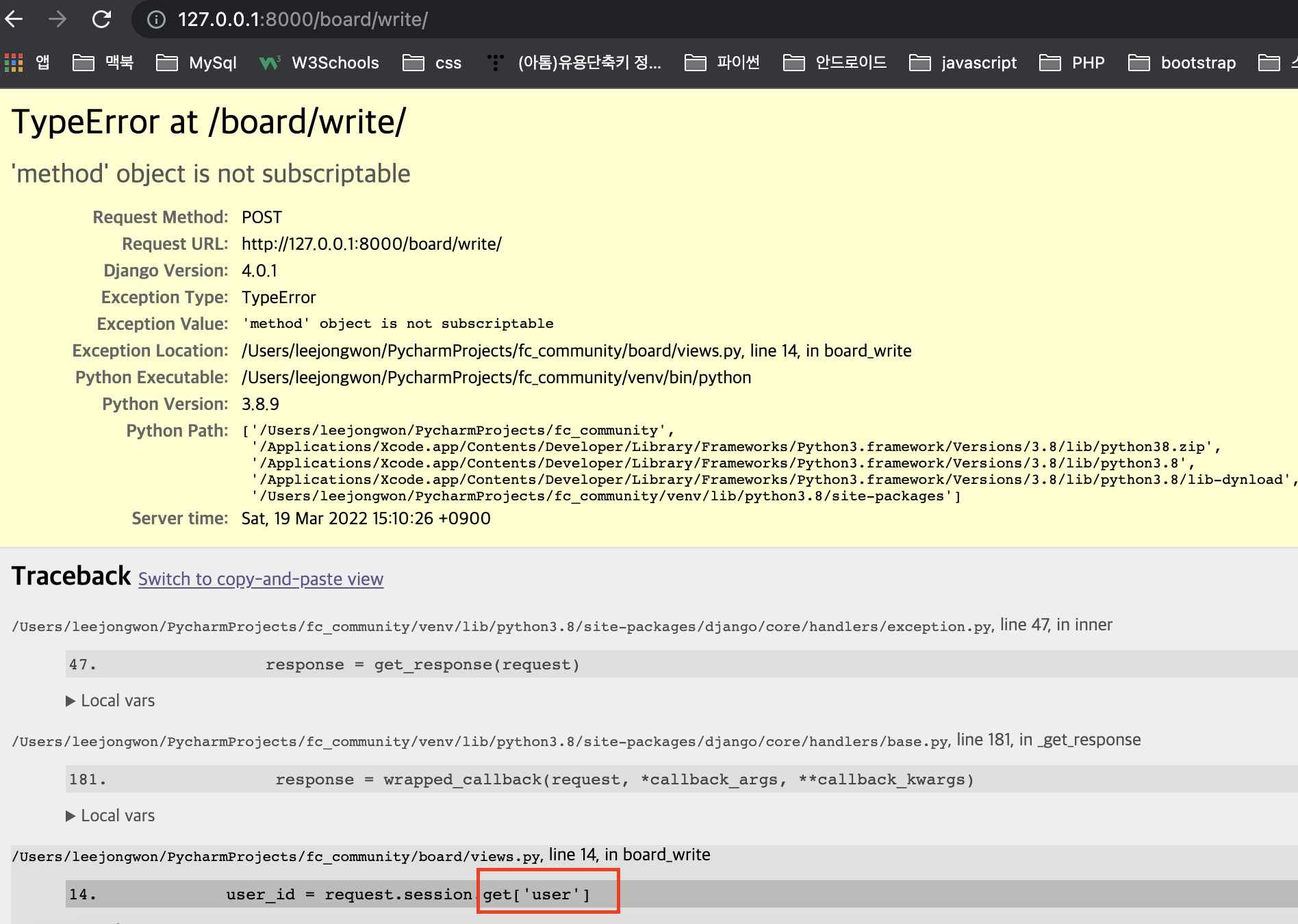 get('user') 인데 get['user'] 형태로 첨자사용이 맞지 않아서 나타나는 에러이다.