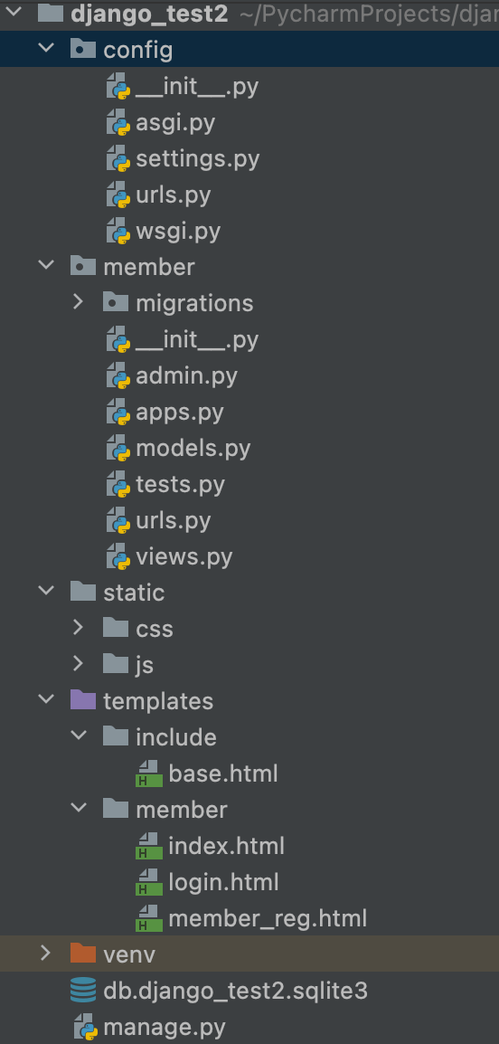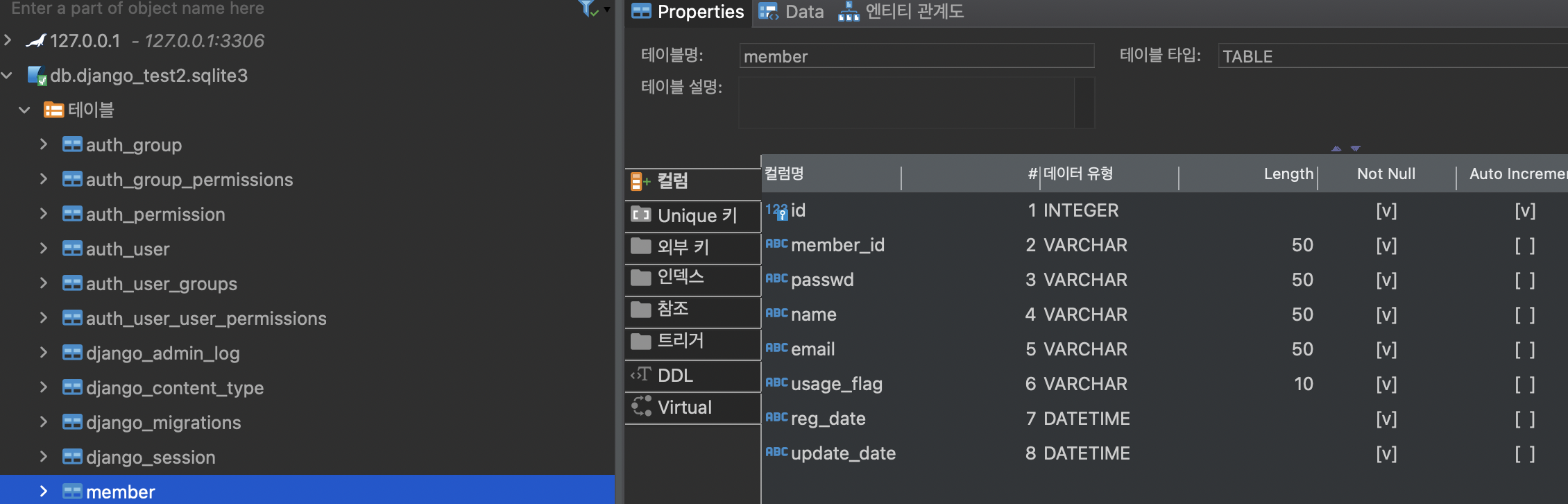 DB는 자제 sqlite3 에서, 별도로 member 기본 회원테이블을 간략히 아래와 같이 구성하였다.