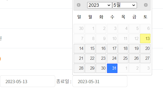 이번에는 오늘날짜가 2023-05-13 일때 시작일은 오늘로 하고, 이달의 마지막날인 31일을 자동으로 종료일 시정하는 소스를 만들어 보자.
