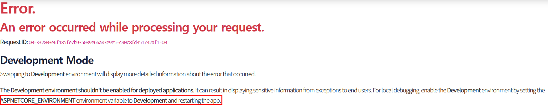 [ASP.Net Core] 배포시 Development Mode 에러날때 - ASPNETCORE_ENVIRONMENT 본문