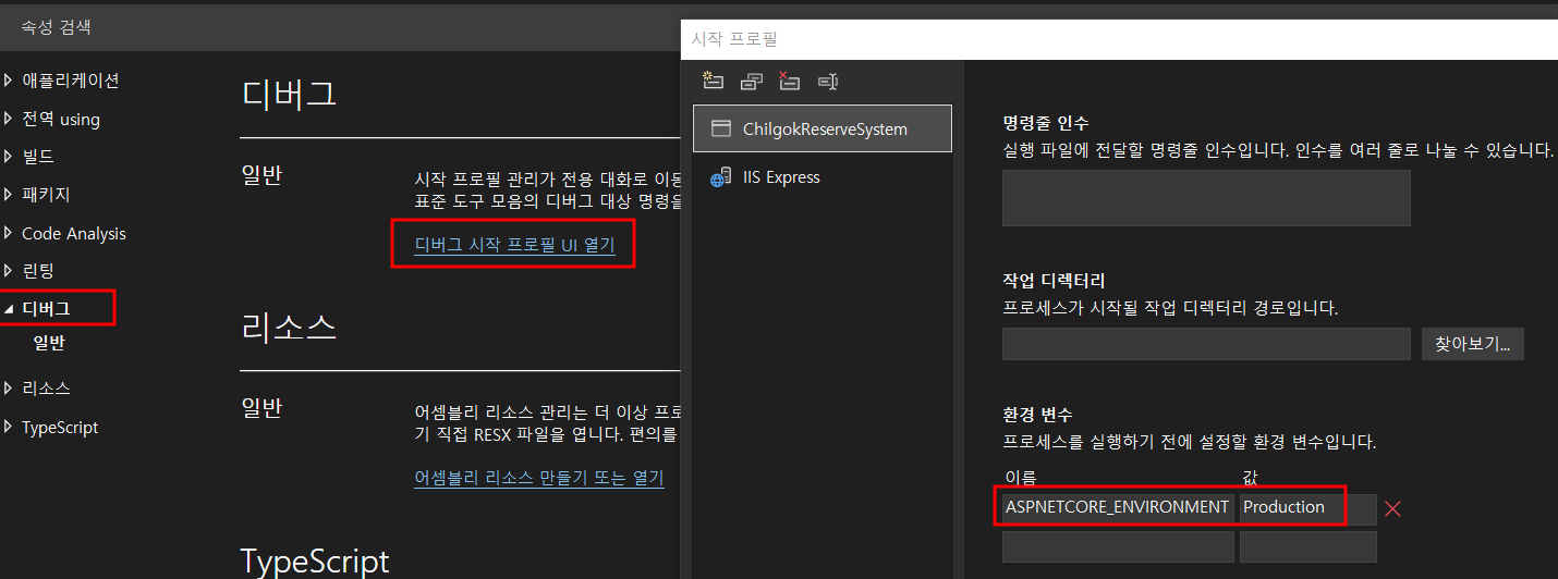 아래와 같이 프로젝트 속성창 > 디버그 > Production 으로 수정
