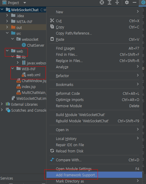 필자는 /web/lib 폴더내 javax.websocket jar 파일을 복사하여 붙여넣고,