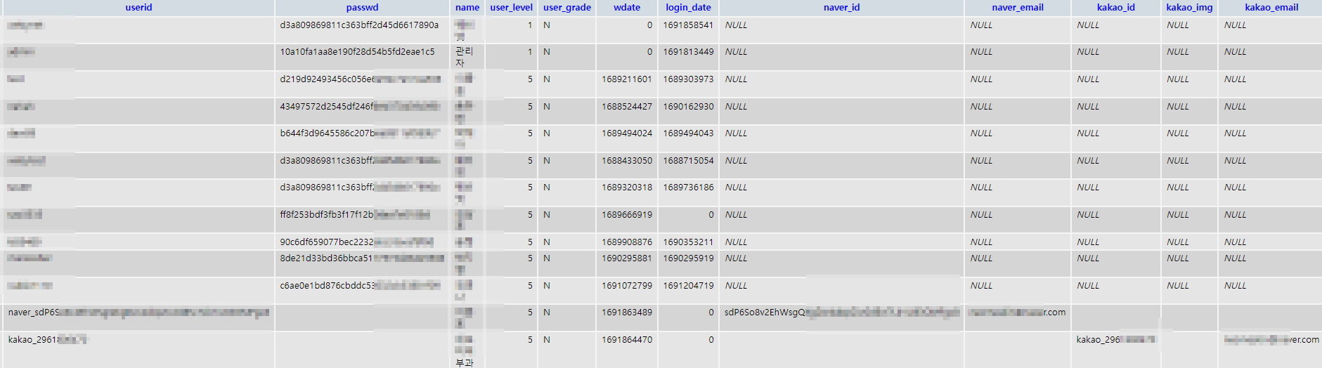 네이버로그인이나 카카오로그인 최초 로그인시에 각각 해당 칼럼에 알맞게 넣을 수 있는 별도 공간을 추가로 마련하였다.