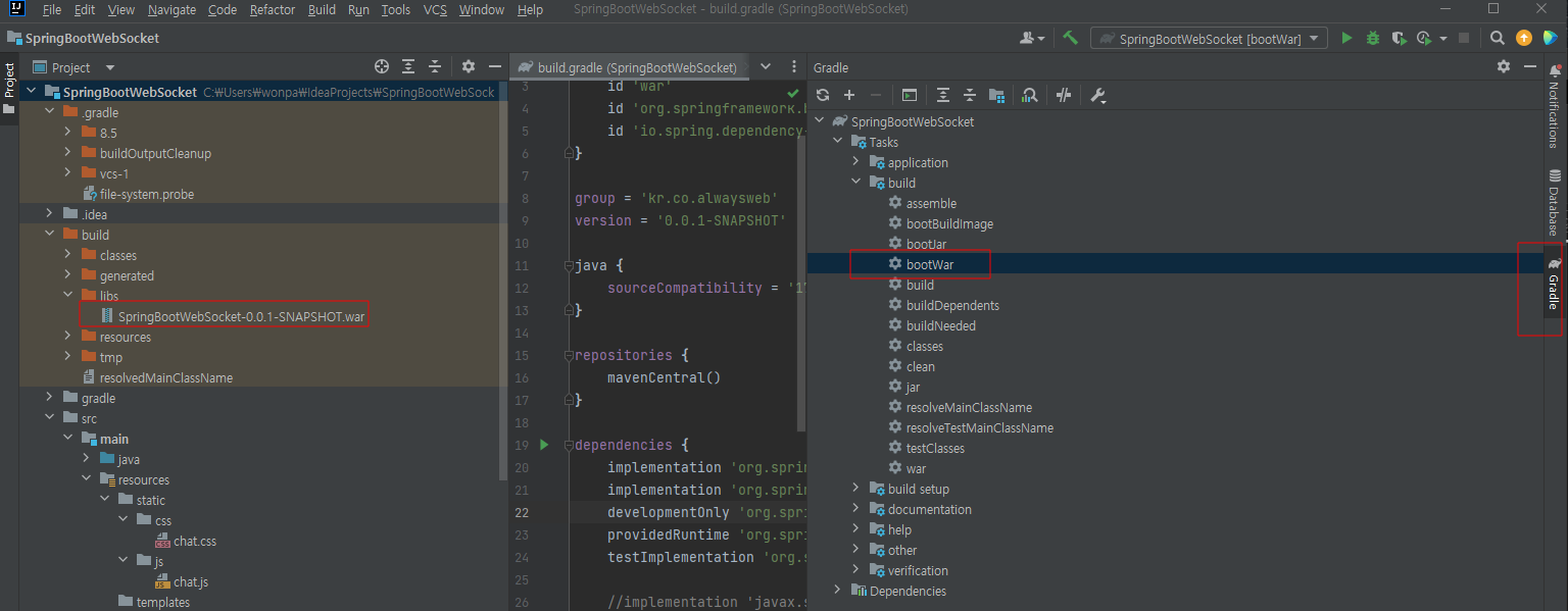 우측 Gradle 창에서 bootwar 클릭하면 /build/lib/war 파일생성