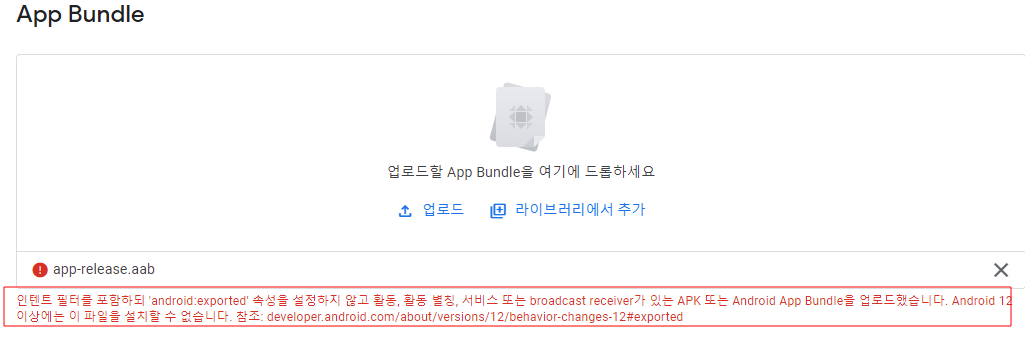 인텐트 필터를 포함하되 'android:exported' 속성을 설정하지 않고 활동, 활동 별칭, 서비스 또는 broadcast receiver가 있는 APK 또는 Android App Bundle을 업로드했습니다. Android 12 이상에는 이 파일을 설치할 수 없습니다.