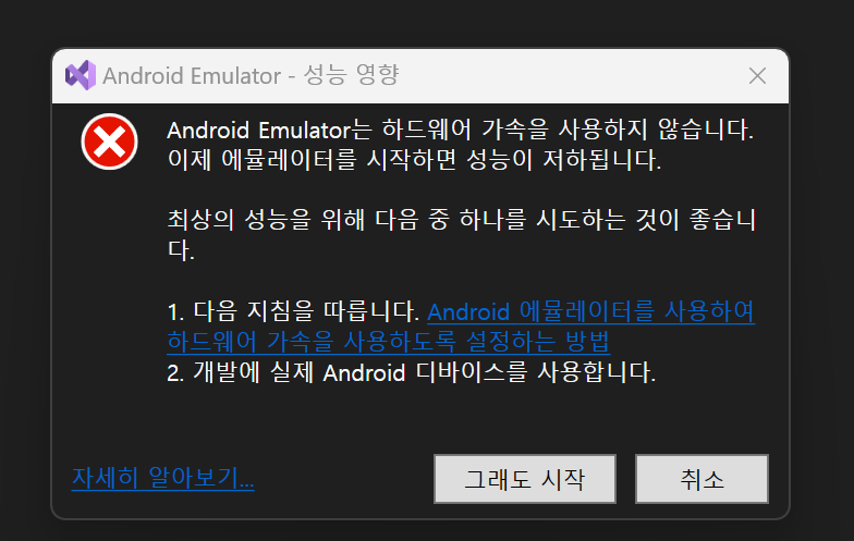 [.NET MAUI] Android Emulator를 사용하여 하드웨어 가속 사용 설정하기 본문