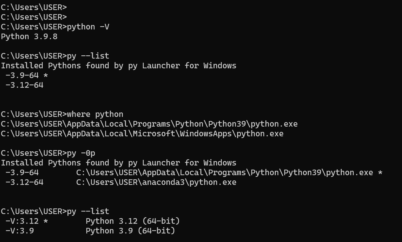 위의 py --list 으로 설치된 여러 버전의 파이썬이 있다면, 현재 3.11 버전에서 기본 파이썬 설정을 3.9 로 변경하고 싶다면