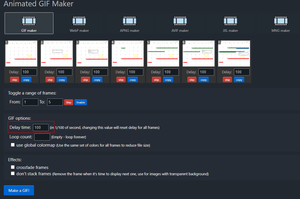 Online GIF maker where you can create animated GIFs, banners, slideshows from sequence of images. Upload frames and make a GIF or merge and edit existing GIFs
